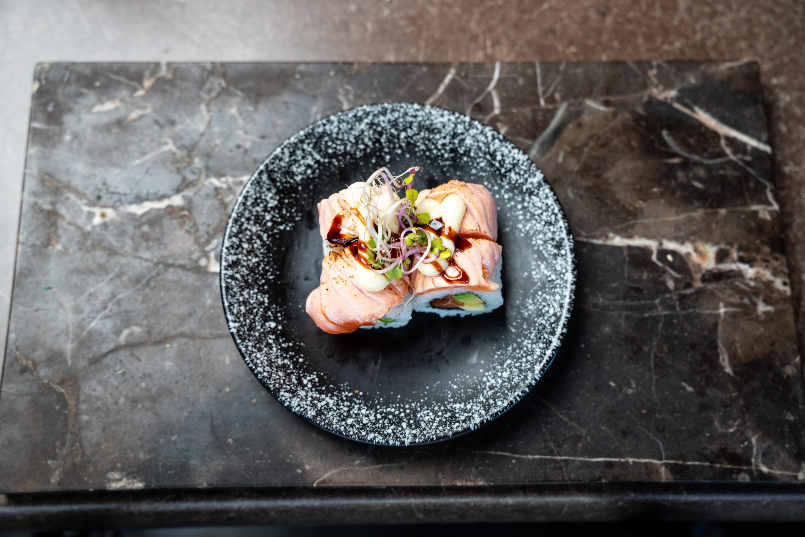 (8 stk.) laks, mango, avocado, toppet med flambert laks, hvidløgsmayo og teriyaki dressing.